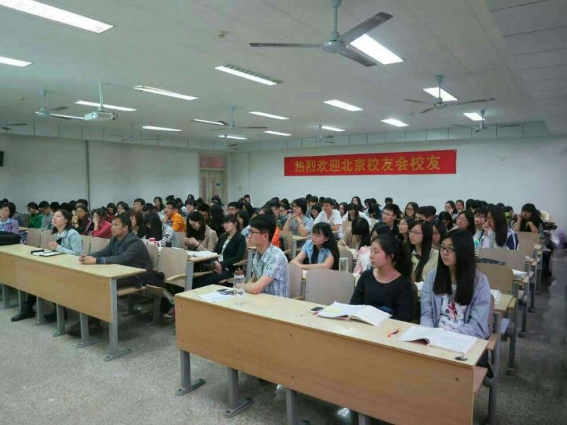 下午两点四十,119教室里早已座无虚席,同学们都在激动地讨论着今天的主讲嘉宾,学生会的学生干部们也在积极地布置教室,在教室后方挂着醒目的“热烈欢迎北京校友会校友”横幅,以表示对北京校友会校友的热烈欢迎。三点左右,讲座正式开始。学院党委副书记付亚致辞,简要介绍了北京校友会以及北京校友会与禁忌书屋