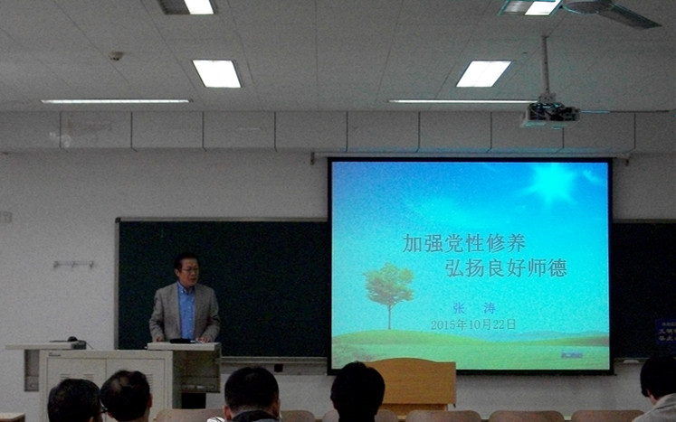 党委书记张涛结合我院工作和教学实际情况,紧紧围绕“加强党性修养弘扬良好师德”的主题做了重要讲话。首先他带领大家共同学习和领会了刘兴云书记在2015年学校党建暨党风廉政建设工作会议上的讲话精神,提出要提高认识、明确责任,努力开创党建工作新局面。他指出要切实增强落实党员干部主体责任的使命感和自觉性,就要真抓实干。做到坚持立德树人,牢牢把握社会主义办学方向;完善运行机制,落实好党委领导下的校长负责制;下移工作重心,激发基层组织和党员队伍活力;持续改进作风,切实加强廉政建设;强化安全意识,构建平安、和谐校园。其次,他从正确理解党性,增强党性修养的角度出发,结合目前实际提出广大党员教师要加强理论修养、政治修养、道德修养、纪律修养和作风修养。他还结合刚刚出台的《中国共产党纪律处分条例》和《中国共产党廉洁自律准则》,强调了党员和领导干部必须严格遵守廉洁自律八条规范。最后,张书记针对目前教学中存在的实际问题,围绕新时期如何做一名好的大学教师,如何树立师德,做了深入的阐述。他指出大学教师应具备崇高的师德风范,常怀修德之心、常施关爱之心、常存仁慈之心;教师应具备基本能力、教学能力、教育能力、教研与自我发展能力以及教学改革与创新能力;教师还应具备责任心、亲和力、严谨教风、深厚功底和诚信谦和的素质。只有从诸多方面自我反省、自我提升才能称得上一名好的大学教师。
