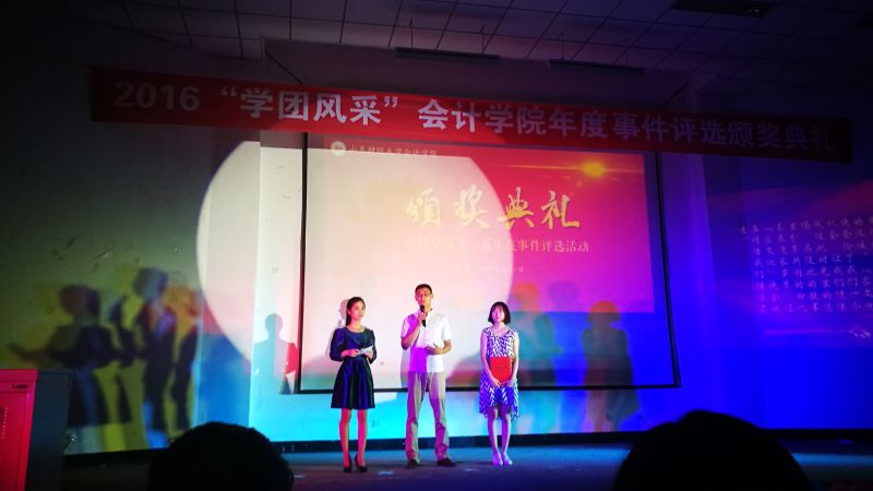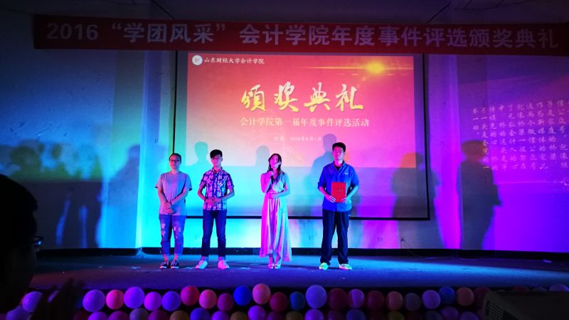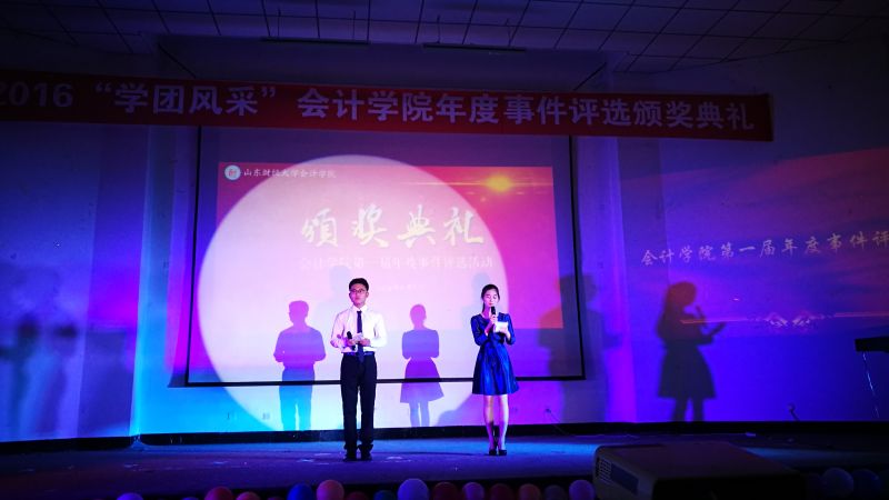 晚六点半,本次颁奖典礼正式开始。琴声飘逸,舞姿曼妙,由禁忌书屋 文艺部编排、“金鸡杯”校园舞蹈大赛获奖作品《玉生烟》用清丽古雅的蒹葭之美为颁奖仪式拉开序幕。主持人简要介绍到场嘉宾后,开始播放二十个候选年度事件的介绍视频,每个事件风采各异,感动相同,深深吸引着在场所有人的目光。伴随着颁奖视频和真挚感人的颁奖词,获奖年度事件代表依次上台领奖并发表了各自的获奖感言。 “禁忌书屋 质点通讯社”和“禁忌书屋 会计学缘”两个微信公众号的工作人员真诚的说:“感谢老师与同学们的支持,感谢一起工作的兄弟姐妹,我们会继续努力。”纯朴的话语透露着对未来的坚定信念,赢得了热烈的掌声。荣获“中国大学生自强之星”提名奖的李洪霞同学用乐观自信的话语,向所有人传递出笑对生活风雨的正能量,“命运对我没有不公平,年轻时能够在苦难中摸爬滚打,使我成长的更好!”献礼2015级迎新晚会的沙画表演代表李雨阳说道:“每天上百遍的练习至今记忆犹新,为确保设备完善,我们每个人提前做了许多功课”,向我们真切的诠释了台上一分钟,台下十年功的深刻含义。2012级国际会计实验班团支书周晓坤代表荣获“山东省五四红旗团支部”和“全国共青团示范团支部”称号的学霸班向她的学弟学妹们分享了促进班级更好发展的经验与感想,用敢拼、敢闯、勇拼搏的会计人精神为财大的每个班级指引着方向。“人心凝聚、弘扬班风、共同配合对于一个班级的发展至关重要,端正态度、踏实专注、努力坚持是学习的法宝。”献礼2015年毕业典礼的禁忌书屋 合唱团负责人马欣萌动情的说“在期末考试之际,合唱团成员能够风雨无阻按时参与排练令人十分感动,展现出身为会院人的凝聚力。走出去,我们代表的是禁忌书屋 ,要拿出禁忌书屋 的魄力与风采!”话语中透露着作为合唱团成员的自豪与骄傲,传递着对未来的美好展望。青春不散场,我们在路上,“会计杯”篮球比赛展现了永不言败的精神与锲而不舍的耐力,“这场用生命的毅力和耐力,用生命的速度和技巧所展示的比赛,凝聚了团队精神,表现了意志品质。”体育部负责人汪志栋的一番话将体育精神诠释的淋漓尽致。“聚是一团火,散是满天星”的星火志愿者协会荣获“山东省青年志愿者服务先进集体”称号,其优秀骨干马东飞用最真切的感受传递着星火的精神理念。“我们希望能够像火苗一样感染更多的人参与公益,将热情与希望带给支教的孩子们。”漫漫前路,星火人定会凭借努力照亮未来。一场“家文化”晚会歌舞了青春飞扬,演绎了会院一家亲。学生会副主席安炳文与副秘书长王辉说道:“家文化晚会最大的魅力在于调动了学生会的每位成员,增强了学生会成员间的凝聚力,让我们意识到这场晚会被称为‘家文化’而不是‘学生会文化’的独特内涵。”时光悠扬,岁月漫长,“家文化”晚会的温情将陪伴会院人继续前进。将目光放于台上,使荣耀照彻希望,令感动留在唇间,让思悟荡在心头,校园心理情景剧《目光》荣获山东省高校心理剧短片DV大赛二等奖,主创人员向观众们讲述着他们的故事,“短剧的成功,依赖于剧组所有人的团结、用心和毅力,他们都是整部剧不可或缺的一部分。”导演姚红宇对剧组的真情告白展现了剧组成员间的深厚友谊,期待他们更精彩的表现!榜样的推举见证楷模的辉煌,榜样的评选点燃人们心中的激情与梦想,这,就是“榜样的力量”年度人物评选活动,吕晓燕老师领奖时讲述了举办活动的初衷,回忆了记忆深刻的榜样人物,“这些年轻人身上彰显出来的奋发向上、锐意进取的精神,感动着我与每位会计学子的心。”评选活动将传承下去,让更多心怀理想的有志青年、品学兼优的学习楷模、积极奉献的公益先锋走进会院学子的心。在颁奖典礼中,穿插了精彩的节目表演,财管1503徐静怡为大家带来的《锦绣前程》,赢得现场阵阵掌声;吕晓燕老师与审计1503范存尧以及沙画团队共同呈现的沙画诗朗诵表演《与你同行》感染着在场的每位观众;会计1502班带来的小合唱《奔跑》彰显出青春活力,展现出大学生昂扬的精神面貌。