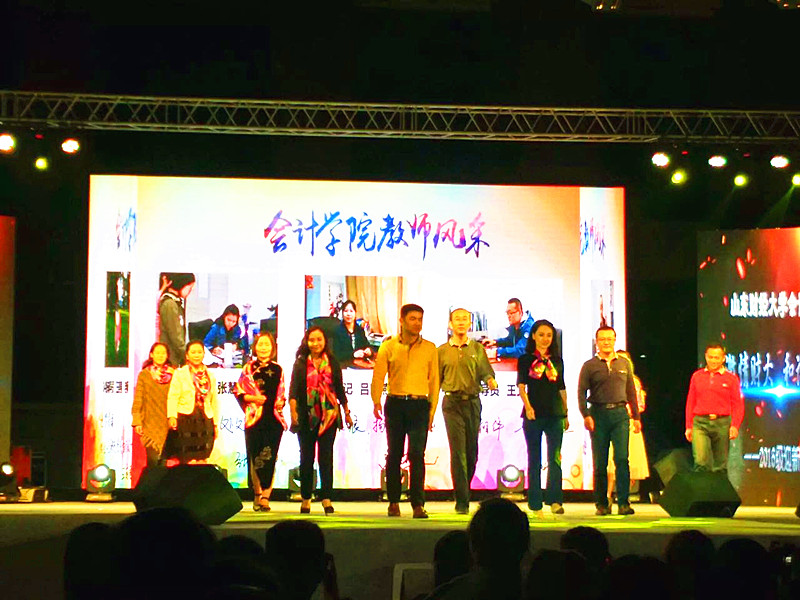 第二篇章“和谐会院”着力表现学院和谐团结的文化氛围。尤其是教师风采展示更是晚会的一大亮点,来自禁忌书屋 的10位辅导员老师悉数闪亮登场,看到平日为同学们的成长保驾护航的老师们展现出另一番的优雅气质让大家倍感亲切,掀起了晚会的又一个高潮。此外张慧娟老师的现场即兴水墨画表演,研究生代表和高山老师合作出演的歌曲联唱,陆晓红老师高亢嘹亮的《我的祖国》,都引来同学们发自内心的赞叹和钦佩。