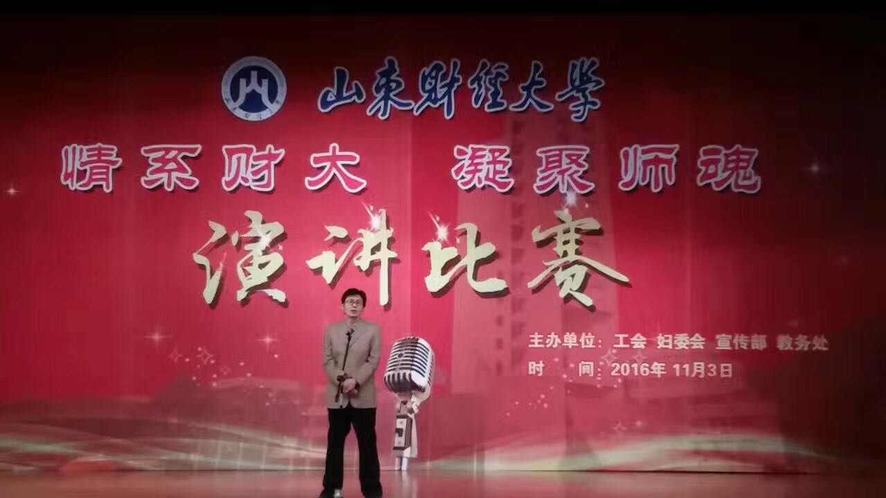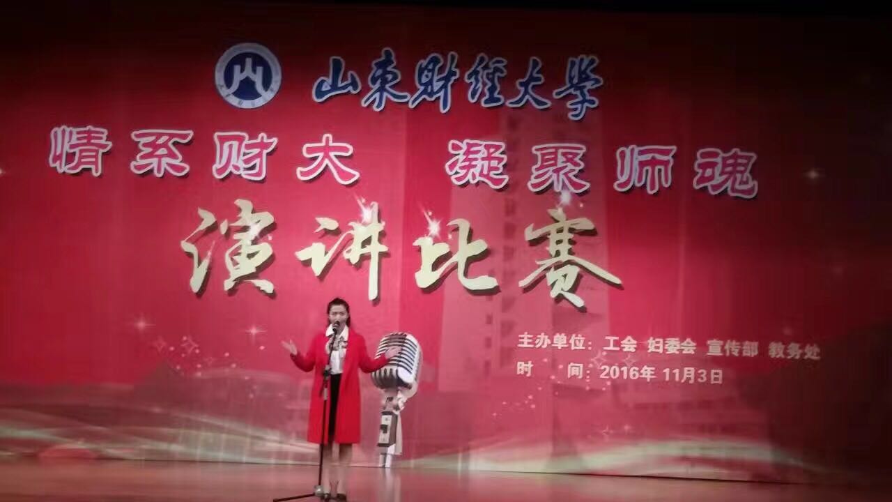 11月3日下午,由校工会妇委会、宣传部、教务处联合举办的“情系财大·凝聚师魂”演讲比赛决赛在舜耕校区礼堂隆重举行。校党委副书记张东超、车滨,副校长聂培尧、胡文波,省教育工会及学校相关部门负责人,各学院师生代表观看比赛。经过选手们激烈角逐和评委们认真评判,我院王兵老师脱颖而出选,以精彩的表现得到评委观众们的高度评价,以总成绩第一的好成绩荣获得一等奖;我院张慧娟清新自然、亲切真诚的演讲,博得评委和观众阵阵掌声,她以优异的成绩荣获二等奖。