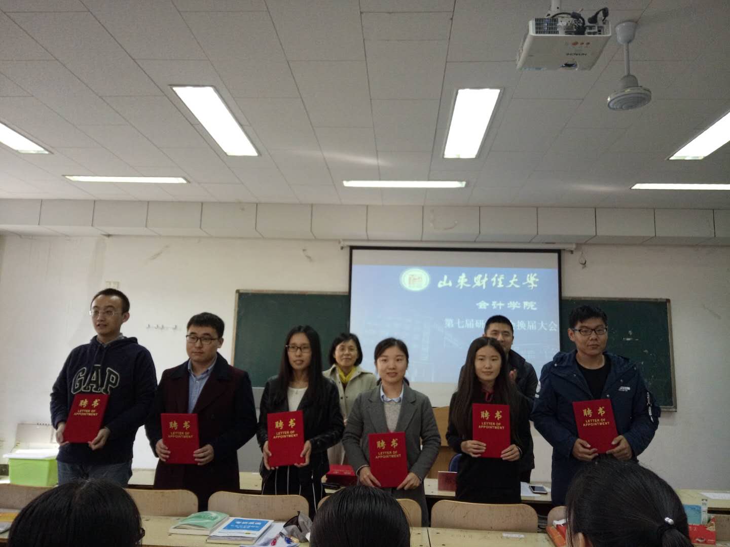 随后,郑大伟老师宣读了第七届研究生会主席团以及纳新名单,并对以上同学表示衷心的祝贺。紧接着付亚副书记和郑大伟老师为第七届研究生会主席团颁发了聘书。