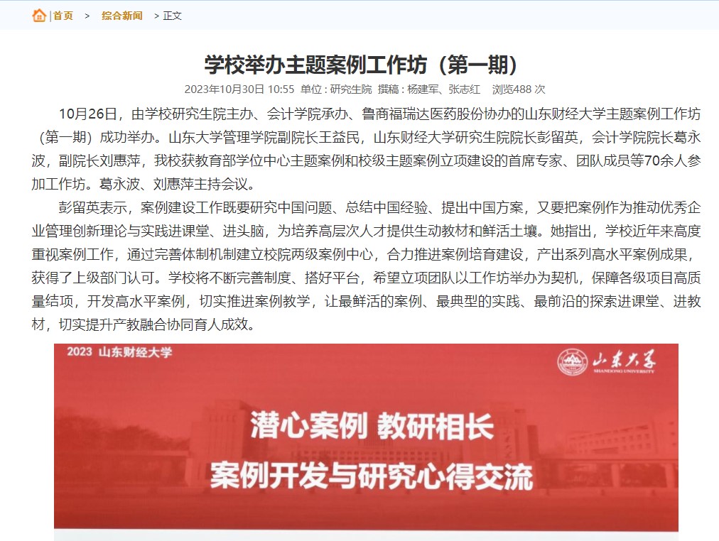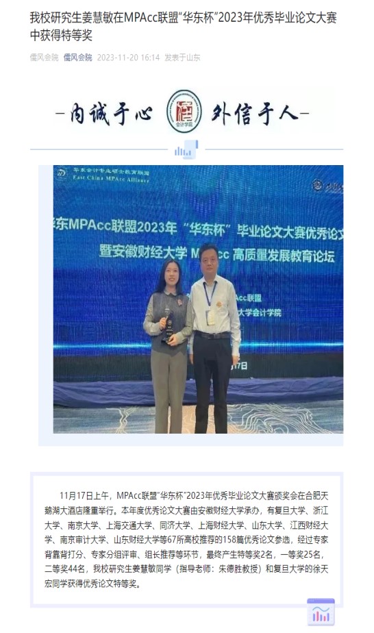5.积极推进研究生导师指导能力提升计划,成果丰硕。立项1项校级研究生教育教学改革项目,1项推荐参评省级研究生教育教学改革项目,立项3项校级研究生教育主题案例,1部研究生教材(《MPAcc案例教学与应用》)获评省级一流教材;《中国情境下专精特新企业自主创新之路》获得教育部主题案例立项;导师发挥示范表率作用,1人获评山东省优秀研究生导师,1人获评校级优秀研究生导师,1支导师团队获评省级研究生优秀导学团队。