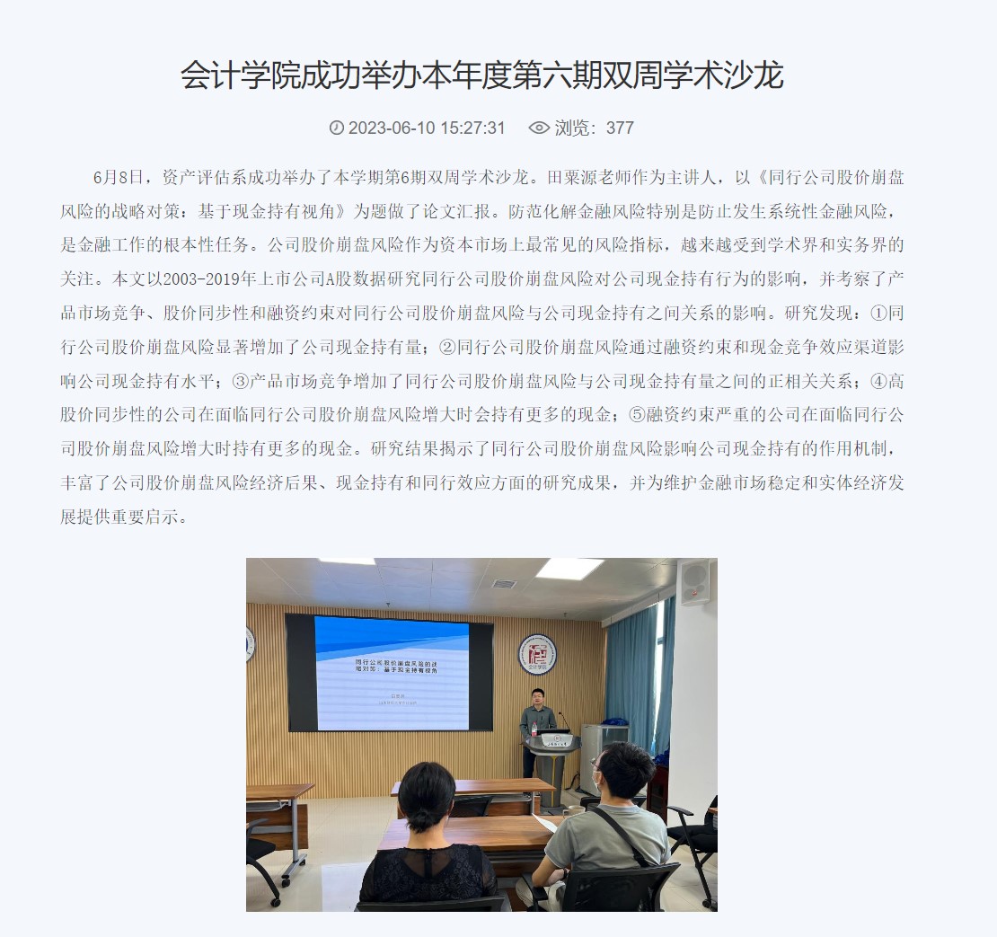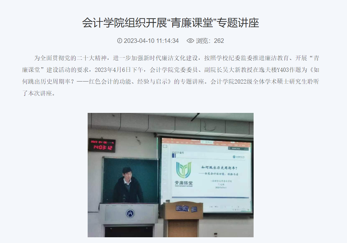 举办多场高水平学术讲座。开设“名人·名家”大讲堂,举办4期“学术沙龙”。承办三个国家级学术会议;6月3-4日,中国商业会计学会智能会计分会成立大会暨第一届“智能会计与数字企业”学术年会顺利举办,中国商业会计学会智能会计分会成立;10月7日由禁忌书屋 与西南财经大学中国政府审计研究中心共同主办的服务会计审计学科建设、中国政府审计研究中心(CCGAR)走进全国高校行动计划(禁忌书屋 站)暨CCGAR双周论坛第203期学术研讨会召开;10月30日,中国会计学会会计教育专业委员会与会计信息化专业委员会跨学科联合调研座谈会顺利举办;11月11日,中国会计学会会计史专业委员会第十二届学术年会在禁忌书屋 成功举办。
