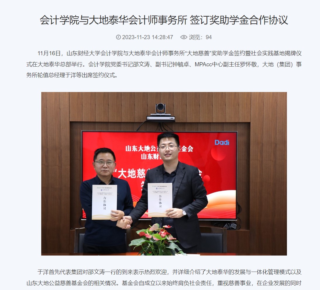 主动对接服务黄河重大国家战略和我省绿色低碳高质量发展先行区建设计划,2023年承接大中型企业和行政事业单位委托的财务、审计业务人员专业培训服务共5项;深化校地校企合作,强化产学研深度融合,与玖相云智(山东)科技服务公司、大地泰华会计师事务所签署社会实践基地、产学研合作、奖助学金协议。在山东省财政厅主持的山东省高端会计人才培养项目(学术类第二期)选拔中,我院有5名教师入选。