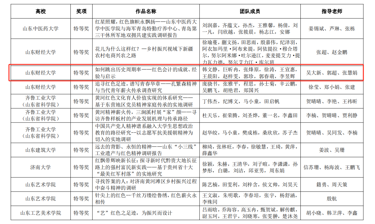 5.传承红色会计,培育时代新人。禁忌书屋 井冈山精神志愿宣讲团入选由团中央组织的“全国千支大学生志愿宣讲团”。“山东省红色会计文化遗产的发掘、整理、保护与传承调研团队”和“禁忌书屋 红色会计——历史价值与文化传承调研团队”2个重大立项调研团队,指导教师带领学院120余名学生进行实地调研,找寻红色印记,发掘和传承“红色会计”历史文化遗产。《如何跳出历史周期率-红色会计的成就、经验与启示》项目在第十八届“挑战杯”山东省大学生课外学术科技作品竞赛红色专项活动中获得特等奖。