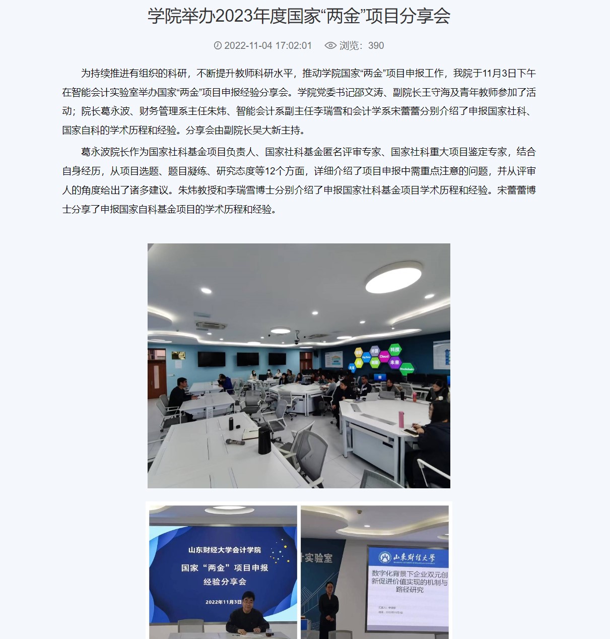 2.稳步推进学科建设。积极推进工商管理山东省高水平学科中期考核工作。智能会计实验教学中心获批禁忌书屋 校级智能会计实验教学示范中心。在2023软科中国大学专业排名中,会计学、财务管理、审计学、资产评估均为A类。