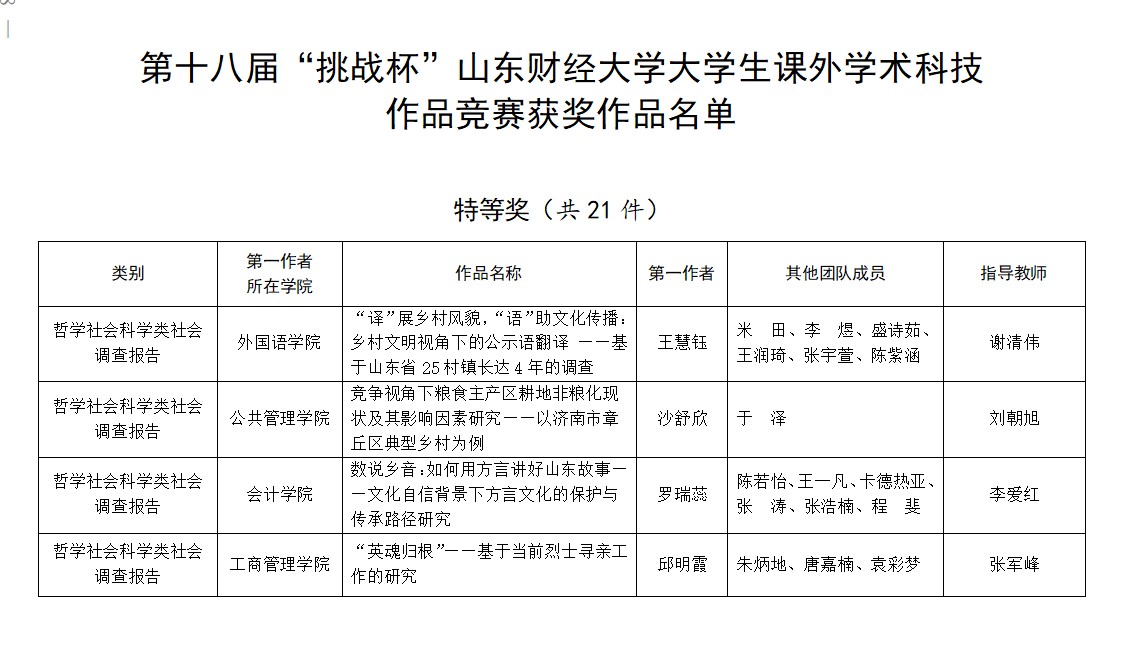 4.强化创新创业教育,完善创新创业人才培养体系。在第十八届“挑战杯”大学生课外学术科技作品竞赛中,我院荣获国家级三等奖1项、省级特等奖1项、校级特等奖2项;第十八届挑战杯“红色专项”中,荣获省级特等奖1项、校级特等奖1项、校级一等奖2项;在第十八届挑战杯“黑科技专项”中,荣获国家级行星级作品1项(相当于国家级二等奖)、校级一等奖1项、校级三等奖1项、校级参与奖22项。在大学生创新创业计划中,荣获国家级立项8项,省级立项16项;在第二届山东省青年志愿服务公益创业赛中,1支团队获得省级铜奖。另有70余支团队获学科创新竞赛国家级、省级奖项。