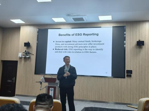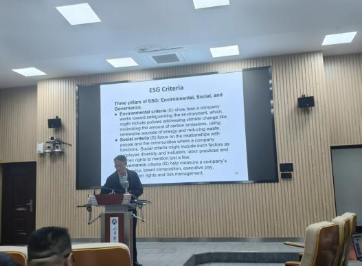 吴大新副院长在开场致辞中对张锡惠教授的到来表示热烈欢迎,并详细介绍了张锡惠教授的学术背景与研究成就。张锡惠现任 Drexel 大学 KPMG 讲座教授。在加入 Drexel 大学之前,他曾在德克萨斯大学达拉斯分校和国立政治大学任教。他毕业于美国明尼苏达大学,获得会计博士学位。他的研究兴趣主要包括审计、管理会计和信息技术,并已在高质量的国际学术期刊上发表了80 余篇论文,其中包括《The Accounting Review》、《Contemporary Accounting Research》、《Journal of Accounting & Economics》、《Management Science》和《Production and Operations Management》。他曾在日本一桥大学、香港城市大学、北京大学、中兴大学和台湾大学担任荣誉讲座教授或客座教授,并拥有多年为营利组织和非营利组织提供咨询的经验。他曾任北美华人会计教授会主席,与国内多位长江学者级别的学者有过合作经历。吴大新副院长强调,随着全球可持续发展理念的深入推进,ESG已成为企业价值评估、投资决策和风险管理的重要考量因素,此次讲座旨在帮助师生把握从传统财务报告到ESG报告的转型趋势,拓宽学术研究视野,提升专业实践能力,为未来学术探索和职业发展奠定坚实基础。
