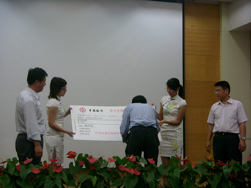 接下来是老校友们为资助我院优秀特困生特别设立的捐赠拍卖和资助环节,现场拍卖了具有特殊意义的三件物品,一本20年前由谢承基教授主编的《管理会计的理论和原理》,一幅印有20年前毕业合影和入场前校友们的亲笔签名的锦旗。校友们争先出价,气氛热烈,现场充满了浓浓的爱心和深深的情谊。最终书被王华同学以封顶价2000元拍走,锦旗等也由盛希泰同学以10万元拍走。其中的1万余元专门作为助学基金现场资助我院的部分优秀困难生。这沉甸甸的奖金不仅代表了老校友们对学校的眷恋与感恩,也饱含着关心教育的各界人士的一片爱心,受资助的同学们深受感动,徐宁作为代表发言表示感谢,并做出承诺,将来一定会继承老校友们光荣传统,用自己的所学回报社会,回报母校。