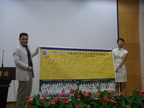 活动开始,一段80年代的音乐仿佛把在场的校友们重新带回了20年前的峥嵘岁月,随后一部反映山经二十年大发展的专题片又把所有人带回到了如今的辉煌时代,让大家为学校和我院这些年来的高速和跨越式发展感叹不已。胡元木教授首先致欢迎辞,山东经济学院前任院长任辉教授,教师代表谢承基教授也分别致辞,忆往昔、看今朝,共同表达了学校对老校友们的热情欢迎。学生代表汤永毅和盛希泰也上台发言,讲述了他们眼中山经的变化,并对学校建设提出自己的建议和期望。